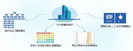 在组织规模大型化、业态多元化、多地域分布、管理水平参差不齐环境下,满足集团总部对下属企业进行人力资源差异化管控而提出各类管理需求,增强组织协作