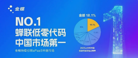 数据显示,2025年上半年,中国低代码和零代码软件市场规模达到21.1亿元人民币,同比增长21.4%。其中,金蝶凭借金蝶AI苍穹平台,以18.1%的市场份额稳居市场首位,已连续多年保持第一排名,进一步彰显了其企业级aPaaS领域的深厚积累与持续创新能力。