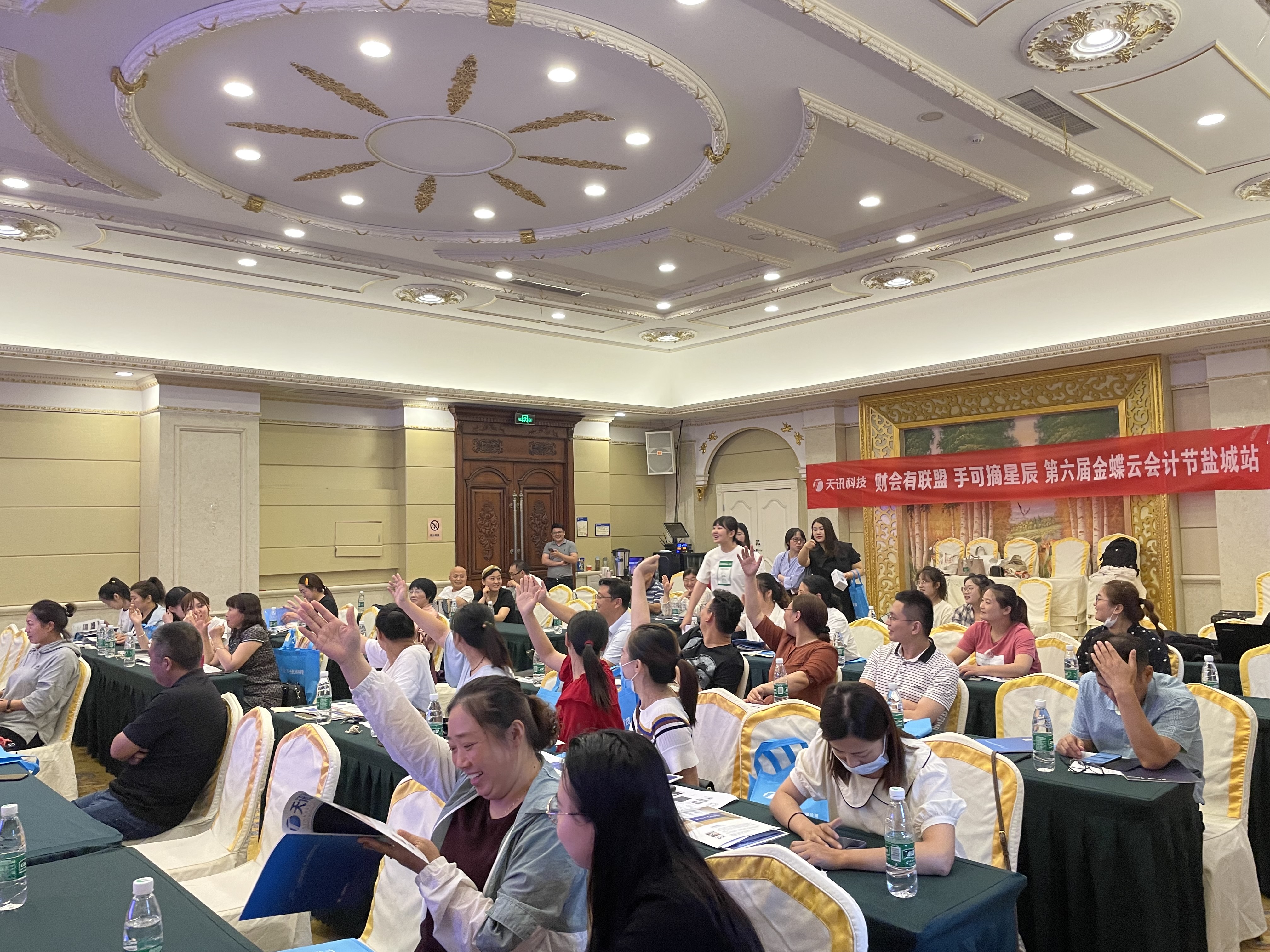 2021年7月16日下午14时30分,“财会有联盟 手可摘星辰”第六届金蝶云会计节盐城滨海站于滨海县凯帝王朝大酒店开启。本次会议由天讯科技销售经理王晓春主持,天讯科技董事长严立兵出席会议并向大家分享了普通财会人员到企业CFO的成长路径以及政府申报项目的内容以及项目协同平台方案。本次会议中还增加了抢答送礼品环节,三轮互动奖品丰厚,参会嘉宾积极活跃,踊跃答题,共抽取十几位中奖嘉宾。互动环节以金蝶软件产品为依托,让参会嘉宾上台参与精斗云零售的体验,竞赛选品、扫码、计算等一系列流程,让会议气氛达到高潮,最终参与比赛的每位嘉宾都带走了自己的战利品。