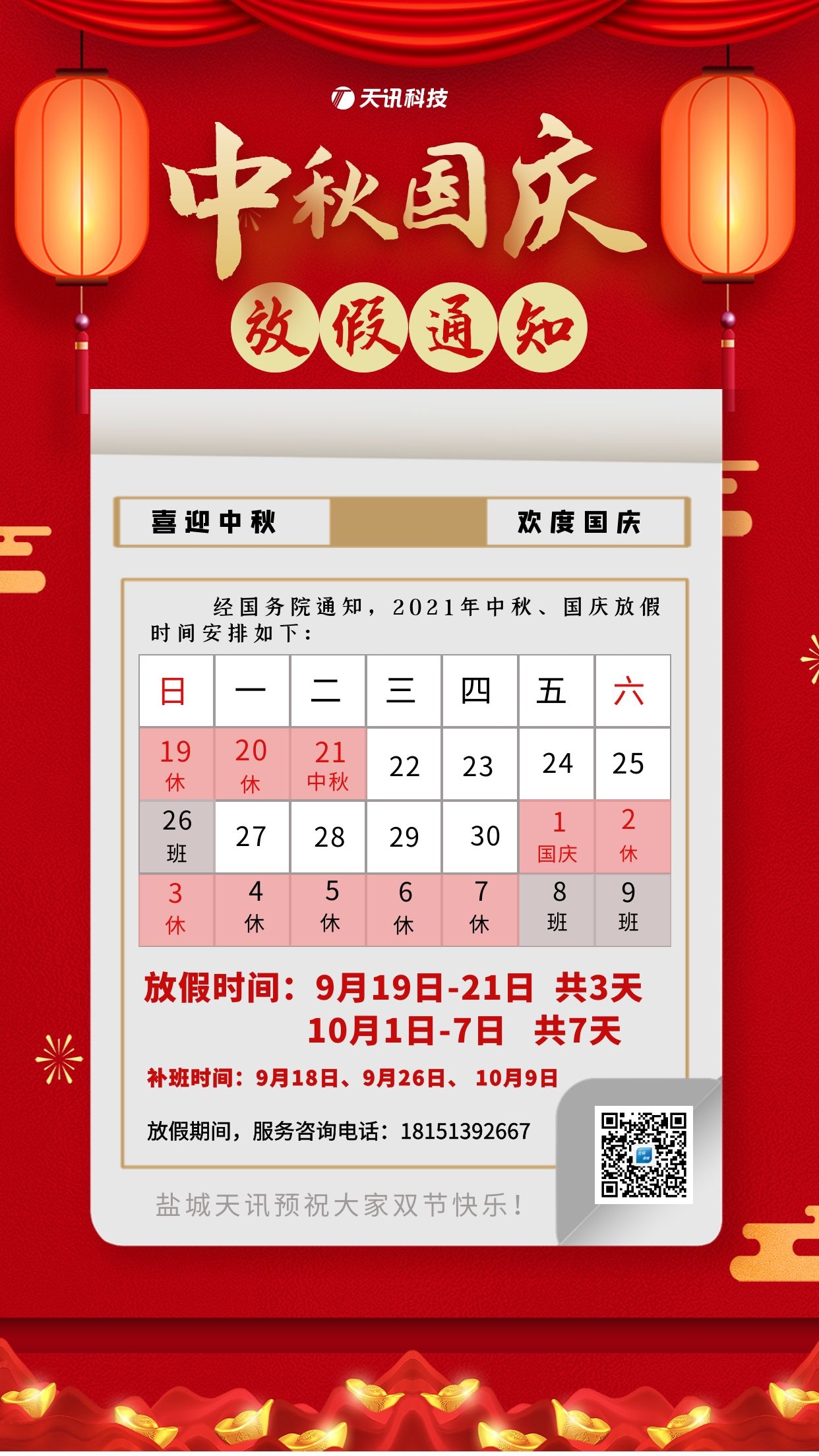 盐城天讯 中秋国庆放假通知