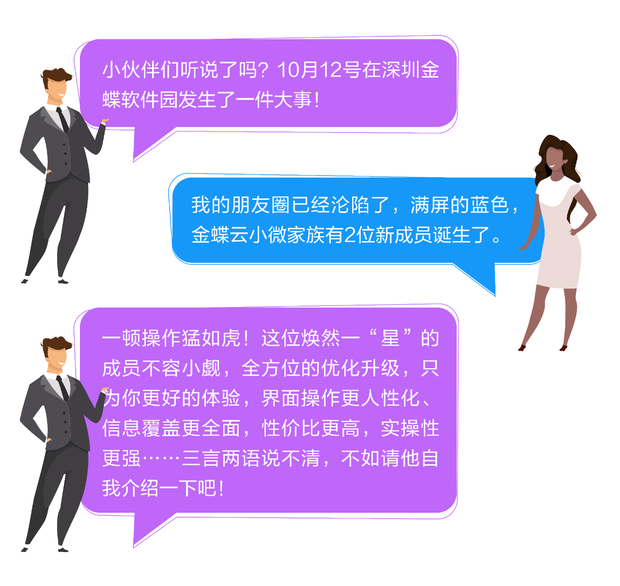 金蝶云星辰·专业版、金蝶云星辰·标准版:大家好,我们是金蝶云小微家族的新成员。我知道大家肯定疑云满布:怎么突然横空出世?你们又有什么硬本事?稍安勿躁,我来一个个给大家介绍。