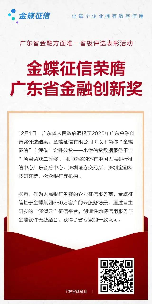 12月1日,广东省人民政府通报了2020年广东金融创新奖评选结果。金蝶征信有限公司(以下简称“金蝶征信”)凭借“金蝶效贷——小微信贷数据服务平台”项目荣获二等奖。
