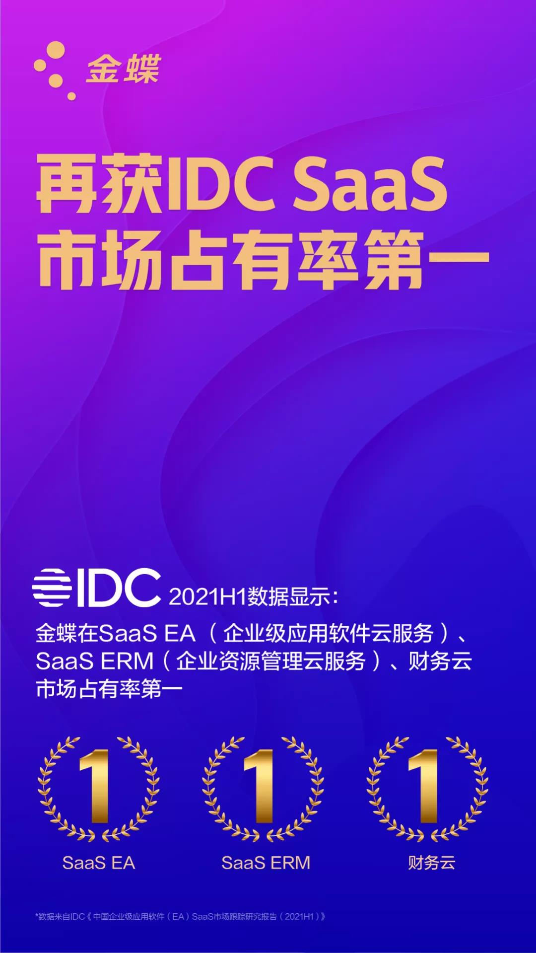 IDC《中国企业级应用软件(EA)SaaS市场跟踪研究报告(2021H1)》,金蝶在2021上半年SaaS EA、SaaS ERM和SaaS财务云市场占比继续蝉联第一。